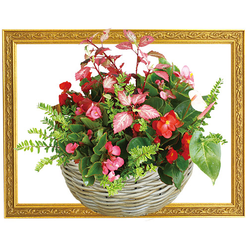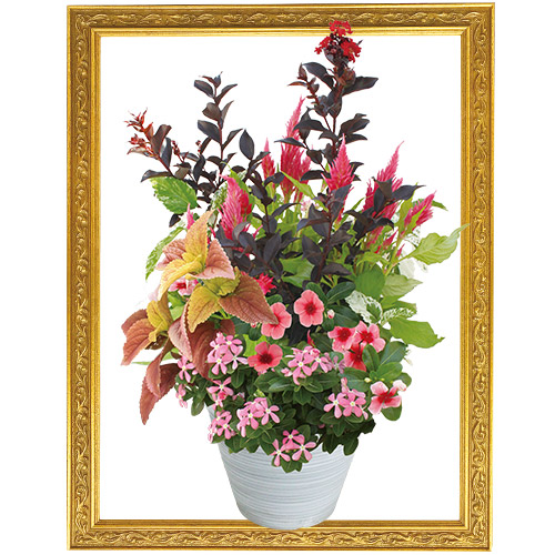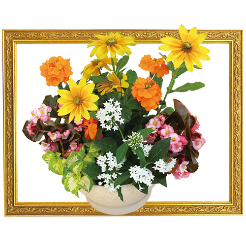 明るいイエロー系の花をメインに、他の花色とのバランスがとれた寄せ植え。
