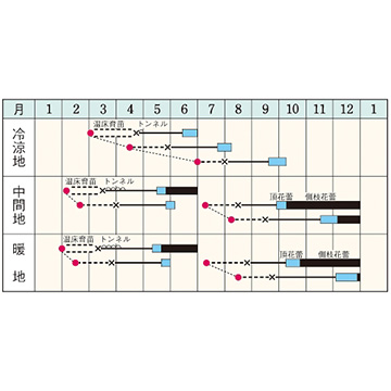 - 花期、収穫期(○○どり)、高さ、収穫重量などの性質は、一般平坦地における適期栽培でのおおよその目安です。
