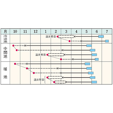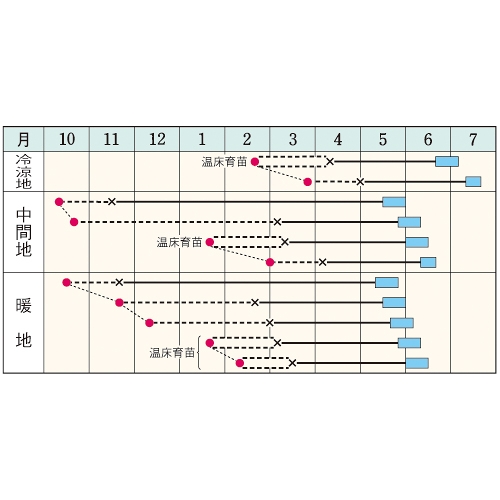 - 花期、収穫期(○○どり)、高さ、収穫重量などの性質は、一般平坦地における適期栽培でのおおよその目安です。