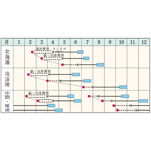 - 花期、収穫期(○○どり)、高さ、収穫重量などの性質は、一般平坦地における適期栽培でのおおよその目安です。