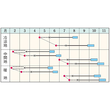 - 花期、収穫期(○○どり)、高さ、収穫重量などの性質は、一般平坦地における適期栽培でのおおよその目安です。
