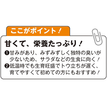 根部は内部まで鮮やかな濃紅色で、食味に優れる。草勢が強く大変作りやすいので減農薬・減肥栽培にも適する。トウ立ちが遅いので、春まき栽培も可能。