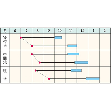 - 花期、収穫期(○○どり)、高さ、収穫重量などの性質は、一般平坦地における適期栽培でのおおよその目安です。