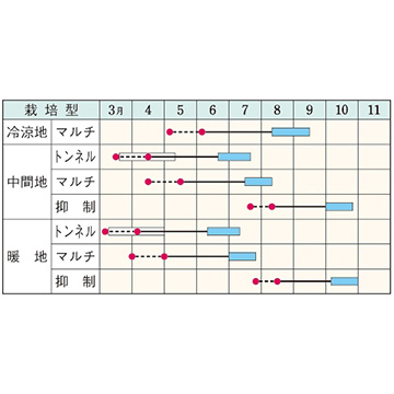 • 花期、収穫期(○○どり)、高さ、収穫重量などの性質は、一般平坦地における適期栽培でのおおよその目安です。