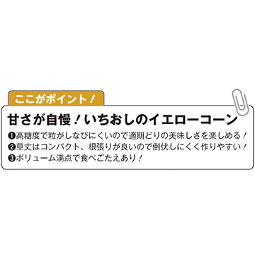 食味に優れ、粒がしなびにくく、ジューシーで高糖度の極良質イエロー種。中間地のマルチ栽培では、播種後85日程度で収穫ができる中早生種。草丈170cm程度。根量が多く2次根の発達が旺盛で倒伏に強い。穂重は苞葉つきで420gとボリューム満点。