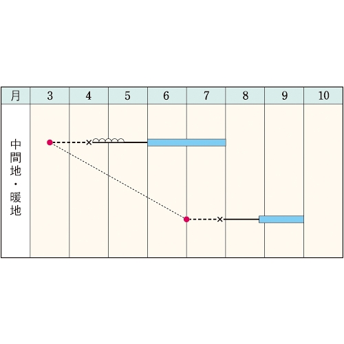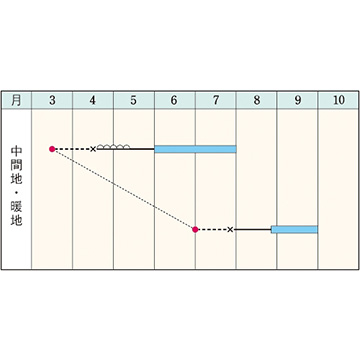 - 花期、収穫期(○○どり)、高さ、収穫重量などの性質は、一般平坦地における適期栽培でのおおよその目安です。