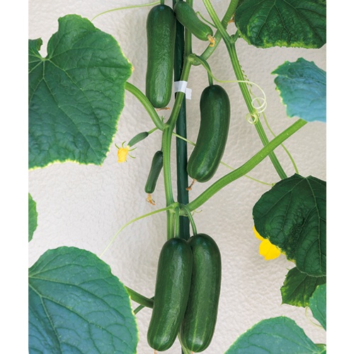 ●主枝に雌花がつきやすく、1節に複数着花する節成タイプ。側枝の発生が少ない。
