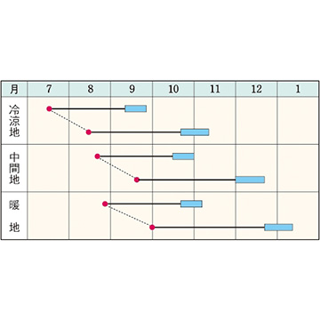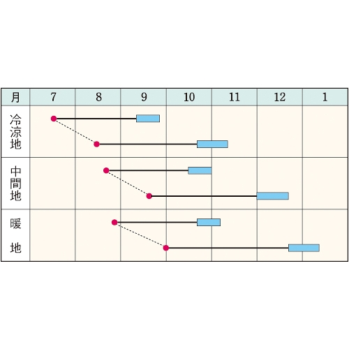 - 花期、収穫期(○○どり)、高さ、収穫重量などの性質は、一般平坦地における適期栽培でのおおよその目安です。