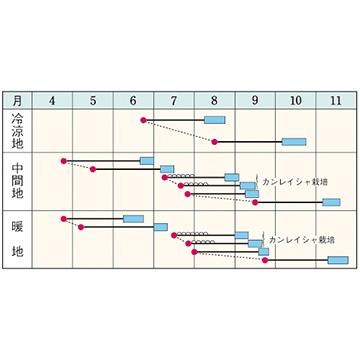 - 花期、収穫期(○○どり)、高さ、収穫重量などの性質は、一般平坦地における適期栽培でのおおよその目安です。