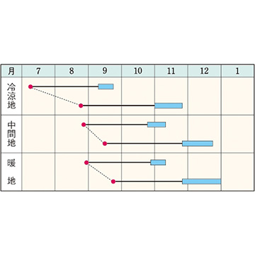 - 花期、収穫期(○○どり)、高さ、収穫重量などの性質は、一般平坦地における適期栽培でのおおよその目安です。