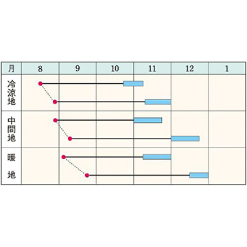 - 花期、収穫期(○○どり)、高さ、収穫重量などの性質は、一般平坦地における適期栽培でのおおよその目安です。