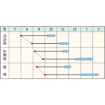 - 花期、収穫期(○○どり)、高さ、収穫重量などの性質は、一般平坦地における適期栽培でのおおよその目安です。