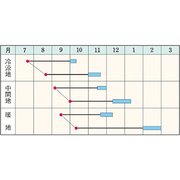 - 花期、収穫期(○○どり)、高さ、収穫重量などの性質は、一般平坦地における適期栽培でのおおよその目安です。