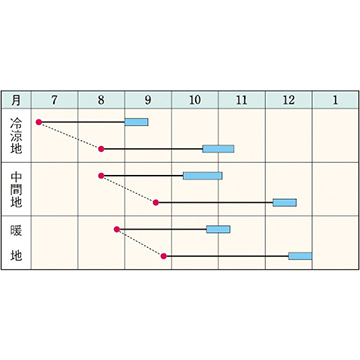 - 花期、収穫期(○○どり)、高さ、収穫重量などの性質は、一般平坦地における適期栽培でのおおよその目安です。