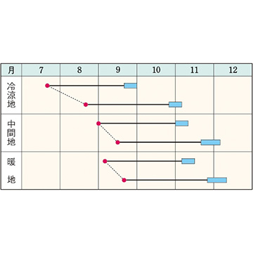 - 花期、収穫期(○○どり)、高さ、収穫重量などの性質は、一般平坦地における適期栽培でのおおよその目安です。