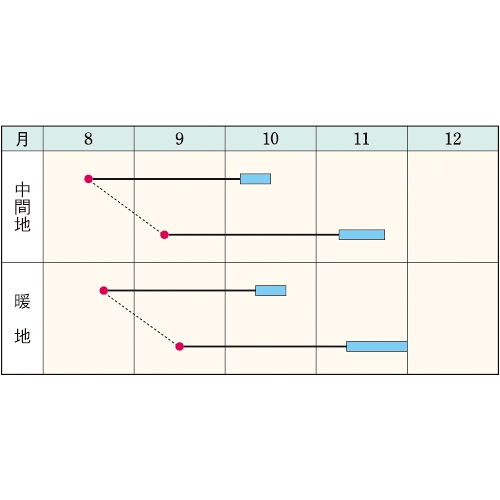 - 花期、収穫期(○○どり)、高さ、収穫重量などの性質は、一般平坦地における適期栽培でのおおよその目安です。