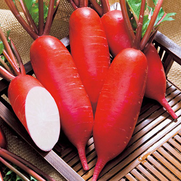 適期まきでは播種後45~50日で収穫できる早生の赤ダイコンで、根長15cm程度になる。草姿はコンパクトで栽培が容易、プランター栽培にも向く。肉質はみずみずしく、サラダや酢漬けに適する。
