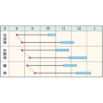 - 花期、収穫期(○○どり)、高さ、収穫重量などの性質は、一般平坦地における適期栽培でのおおよその目安です。