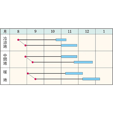 - 花期、収穫期(○○どり)、高さ、収穫重量などの性質は、一般平坦地における適期栽培でのおおよその目安です。