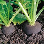 サラダにおすすめな大根で、三杯酢漬としてもおいしい。真っ黒な外皮に純白の果肉が特徴の、直径8~10cmの丸型のダイコン。一般の大根に比べ若干のやわらかみのある食感が美味。春まきはタネまきから55~70日、秋まきは70~90日で収穫できる。