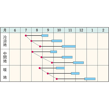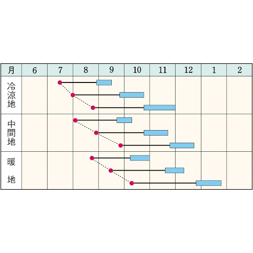 - 花期、収穫期(○○どり)、高さ、収穫重量などの性質は、一般平坦地における適期栽培でのおおよその目安です。
