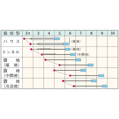 - 花期、収穫期(○○どり)、高さ、収穫重量などの性質は、一般平坦地における適期栽培でのおおよその目安です。