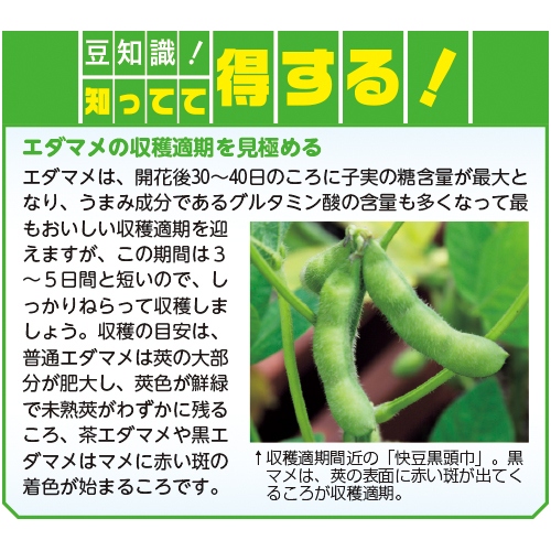 コクのある甘みと黒マメ特有の風味があいまって食味がよい。播種後78日程度で収穫ができる早生種。白花・白毛で外観が美しい。草姿は小葉・立性で枝上部の莢つきに優れる。作りやすく直売所や家庭菜園にも向く。