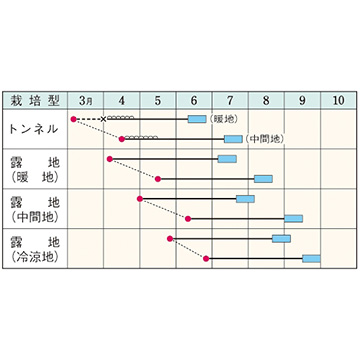 - 花期、収穫期(○○どり)、高さ、収穫重量などの性質は、一般平坦地における適期栽培でのおおよその目安です。