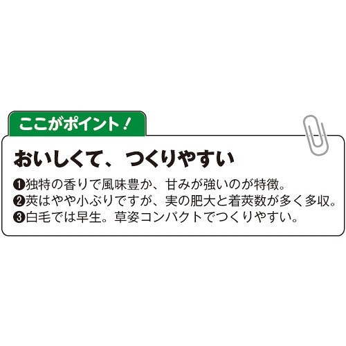 - 花期、収穫期(○○どり)、高さ、収穫重量などの性質は、一般平坦地における適期栽培でのおおよその目安です。