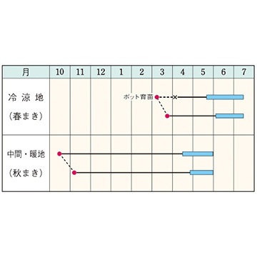 - 花期、収穫期(○○どり)、高さ、収穫重量などの性質は、一般平坦地における適期栽培でのおおよその目安です。