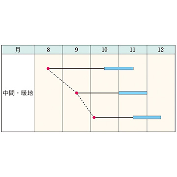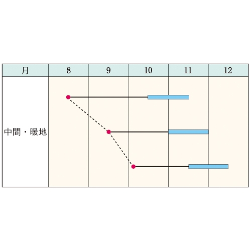 - 花期、収穫期(○○どり)、高さ、収穫重量などの性質は、一般平坦地における適期栽培でのおおよその目安です。