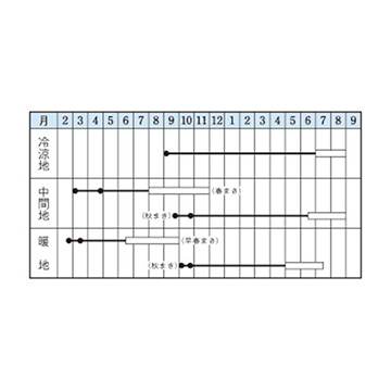 (例)10/上~12/下=10月上旬~12月下旬 9/中より順次=9月中旬より順次 - 1袋の種子粒数は、およその目安として表示しています。実際の粒数と多少差異がありますのでご了承ください。