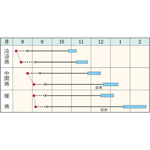 - 花期、収穫期(○○どり)、高さ、収穫重量などの性質は、一般平坦地における適期栽培でのおおよその目安です。