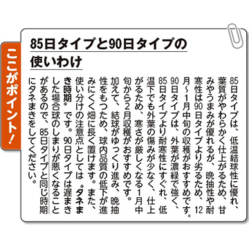 中生85日タイプ。耐寒性が強く、低温結球性・肥大性に加え晩抽性にも優れるので、栽培適期幅が広い。玉は尻張り・胴張りのよい円筒形、球内色は濃黄色で品質良好。