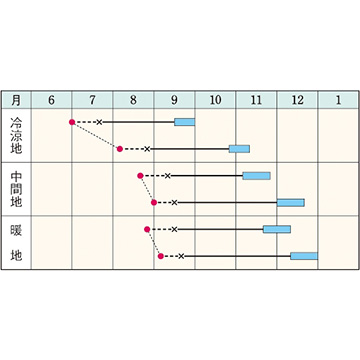 - 花期、収穫期(○○どり)、高さ、収穫重量などの性質は、一般平坦地における適期栽培でのおおよその目安です。