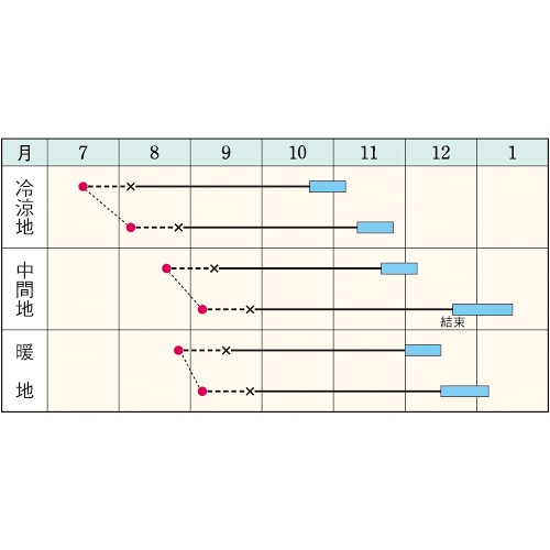 - 花期、収穫期(○○どり)、高さ、収穫重量などの性質は、一般平坦地における適期栽培でのおおよその目安です。