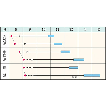 - 花期、収穫期(○○どり)、高さ、収穫重量などの性質は、一般平坦地における適期栽培でのおおよその目安です。