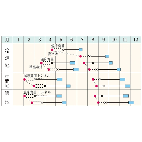- 花期、収穫期(○○どり)、高さ、収穫重量などの性質は、一般平坦地における適期栽培でのおおよその目安です。
