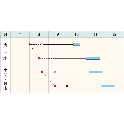 - 花期、収穫期(○○どり)、高さ、収穫重量などの性質は、一般平坦地における適期栽培でのおおよその目安です。