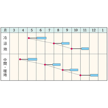 • 花期、収穫期(○○どり)、高さ、収穫重量などの性質は、一般平坦地における適期栽培でのおおよその目安です。