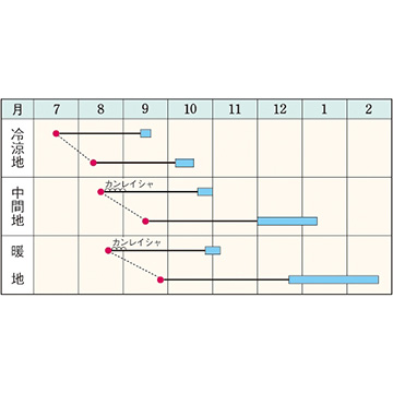 - 花期、収穫期(○○どり)、高さ、収穫重量などの性質は、一般平坦地における適期栽培でのおおよその目安です。