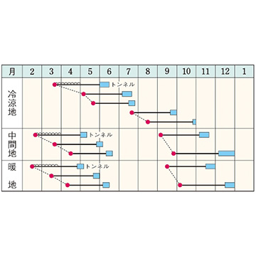 - 花期、収穫期(○○どり)、高さ、収穫重量などの性質は、一般平坦地における適期栽培でのおおよその目安です。