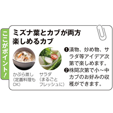 通常のカブと異なり葉軸が細く深い切れ込みがあり、葉もミズナのようにおいしく、上から下まで丸ごと楽しめる。根こぶ病(※)にも強い。