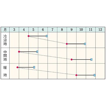 - 花期、収穫期(○○どり)、高さ、収穫重量などの性質は、一般平坦地における適期栽培でのおおよその目安です。