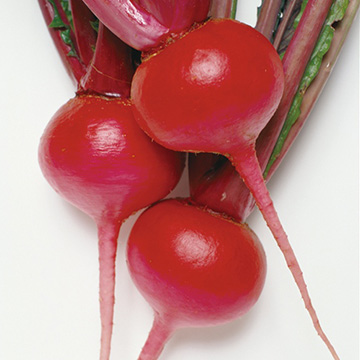 根部の表皮は美しい鮮紅色で、葉柄や葉脈も先まで濃紅色。家庭菜園でも作りやすく、肉質は緻密で甘みが強く、煮食、酢漬、塩漬に好適。
