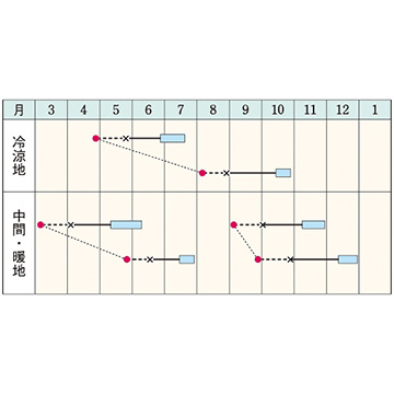 - 花期、収穫期(○○どり)、高さ、収穫重量などの性質は、一般平坦地における適期栽培でのおおよその目安です。