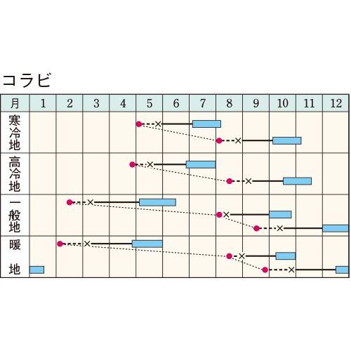 - 花期、収穫期(○○どり)、高さ、収穫重量などの性質は、一般平坦地における適期栽培でのおおよその目安です。