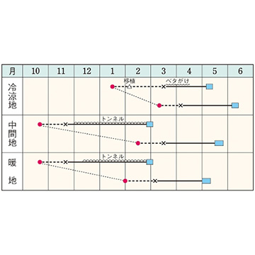 低温下での玉太りと早生性に優れ、春の早どりに適する。