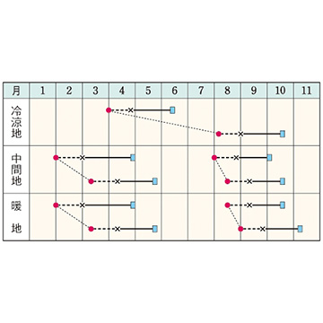 - 花期、収穫期(○○どり)、高さ、収穫重量などの性質は、一般平坦地における適期栽培でのおおよその目安です。