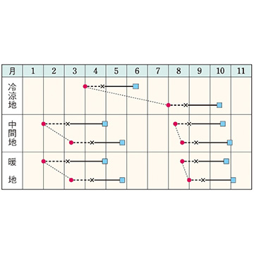 - 花期、収穫期(○○どり)、高さ、収穫重量などの性質は、一般平坦地における適期栽培でのおおよその目安です。